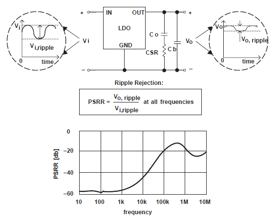 Power Supply Rejection Ratio (PSRR)은 Ripple Rejection이라고도 불리며, 입력 전압 변동으로 인한 출력 전압 변동을 방지하는 LDO 레귤레이터의 기능을 말한다. 전체 주파수 스펙트럼이 고려된다는 점을 제외하곤 line regulation과 동일한 관계가 PSRR에 적용된다.