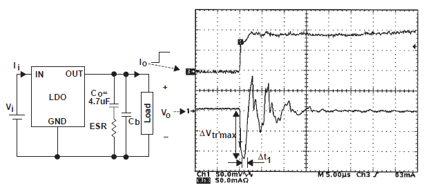 과도응답은 출력 캐패시터 값(Co)과 출력 캐패시터의 등가직렬저항(ESR, Equivalent Series Resistance), 그리고 출력 캐패시터에 과도응답을 개선하기 위해 추가하는 바이패스 캐패시터(Cb), 그리고 최대 로드 전류(Io,max)에 의해 정해진다.