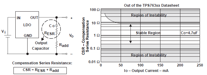 일반적으로 LDO 제조업체는 CSR(보상직렬저항) 값의 안정적인 범위를 보여주는 그래프를 제공한다. CSR은 출력 전류와 관련하여 불안정성을 유발할 수 있기 때문이다. CSR은 출력 캐패시턴스의 등가직렬저항(Resr)과 추가 저항(Radd)의 합을 나타낸다.