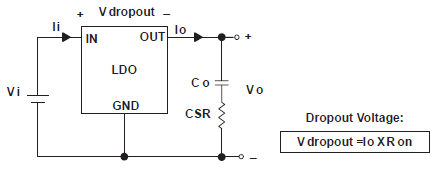 Dropout 전압은 회로가 입력 전압의 추가 감소에 대해 조절을 중단하는 입력 대 출력 차동 전압을 뜻한다. 이 지점은 입력 전압이 출력 전압에 근접할 때 발생한다. 그림 1은 일반적인 LDO 레귤레이터 회로를 나타낸다. Dropout 영역에서, PMOS 패스 요소는 단순히 저항이며 Dropout은 온저항(Ron)으로 표현된다.