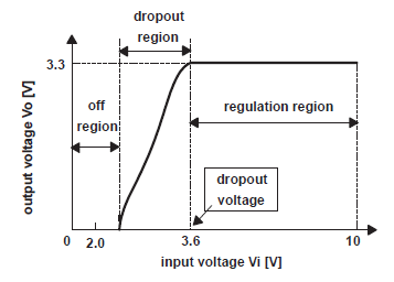 예를 들어, 그림 2는 TPS76733 3.3-V LDO 레귤레이터의 입력/출력 특성을 보여준다. TPS76733의 Dropout 전압은 일반적으로 1A에서 350mV입니다. 따라서 LDO 레귤레이터는 3.65-V 입력 전압에서 빠지기 시작한다. Dropout 영역의 범위는 약 2-V와 3.65V 사이이다. 이 아래에서는 레귤레이터가 작동하지 않는다.