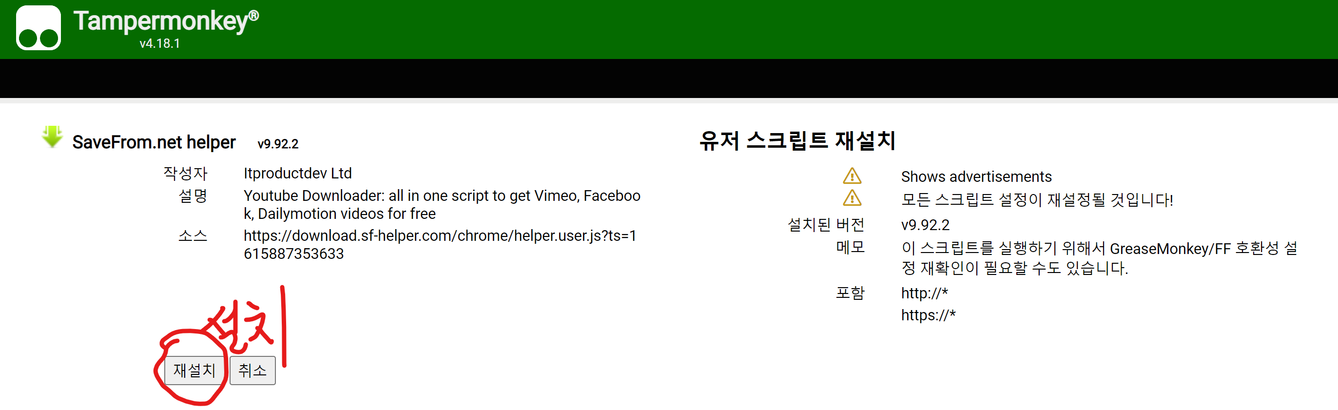 2단계: Tampermonkey 유저 스크립트 설치 (Savefrom net helper)
