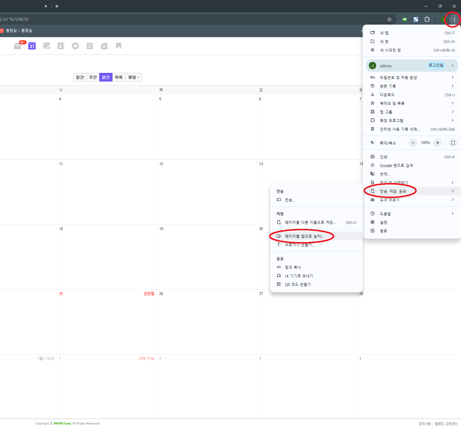 그리고 아래 사진처럼 '...' -> 전송, 저장, 공유 -> 페이지를 앱으로 설치