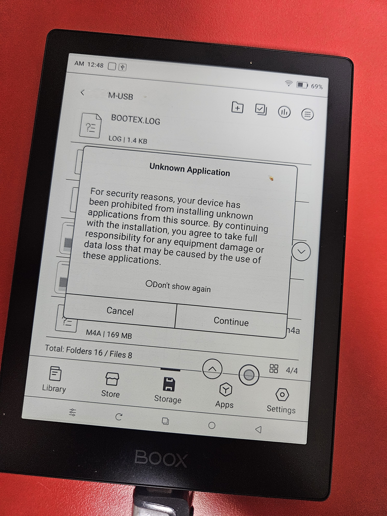 한국어로 따지면 '출처를 알수 없는 앱 설치'에 관한 경고문이라고 보시면 됩니다. 그러나 우리는 출처리 밀리의서재라는 것을 알고있으니 신경쓰지 마시고 Continue 를 누르시면 됩니다.
