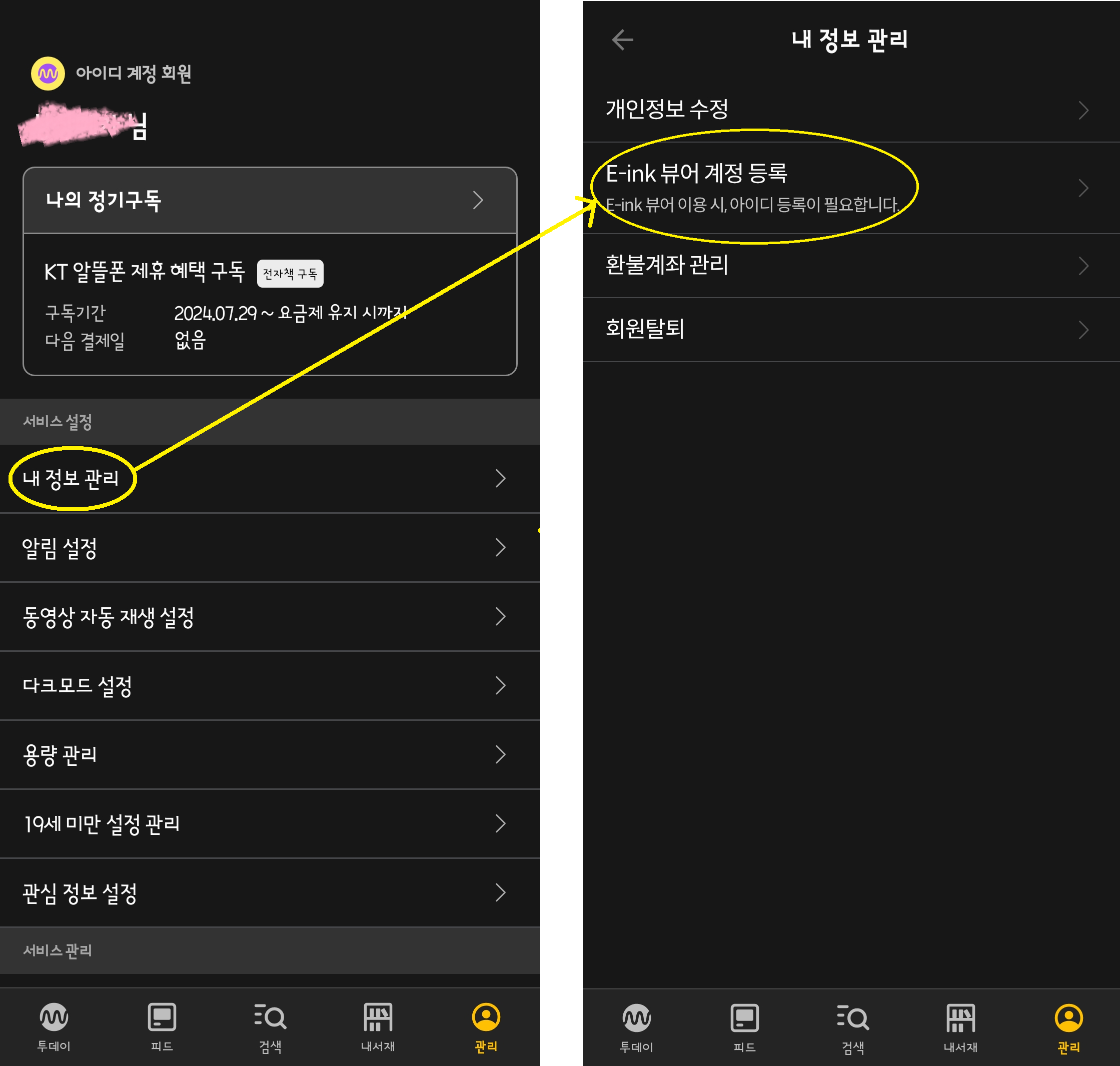 그리고 사진처럼 '내 정보 관리' -> 'E-ink 뷰어 계정 등록' -> (통합회원이 아닐경우) 통합회원 등록 -> E-ink 뷰어 계정 등록'