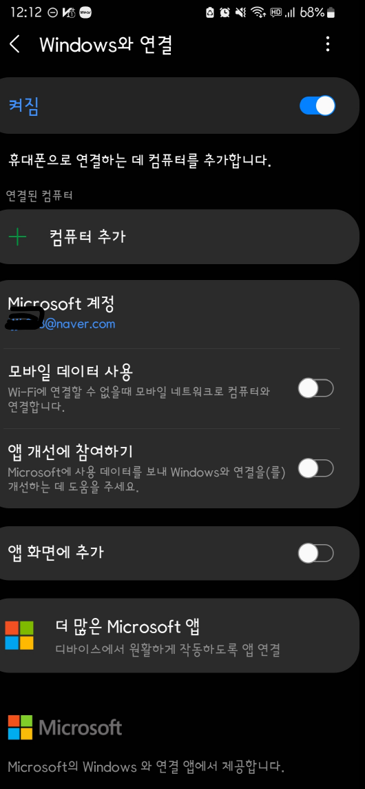 일단 한번 연결해놓으면 자동연결이 되는데, 이거를 불편해하는 분들이 분명 있을겁니다. 자동연결이 안되게 하기 위해서는 핸드폰의 Windows와 연결 앱에서 켜짐을 꺼짐으로 바꿔주세요. 그럼 자동연결은 안됩니다.