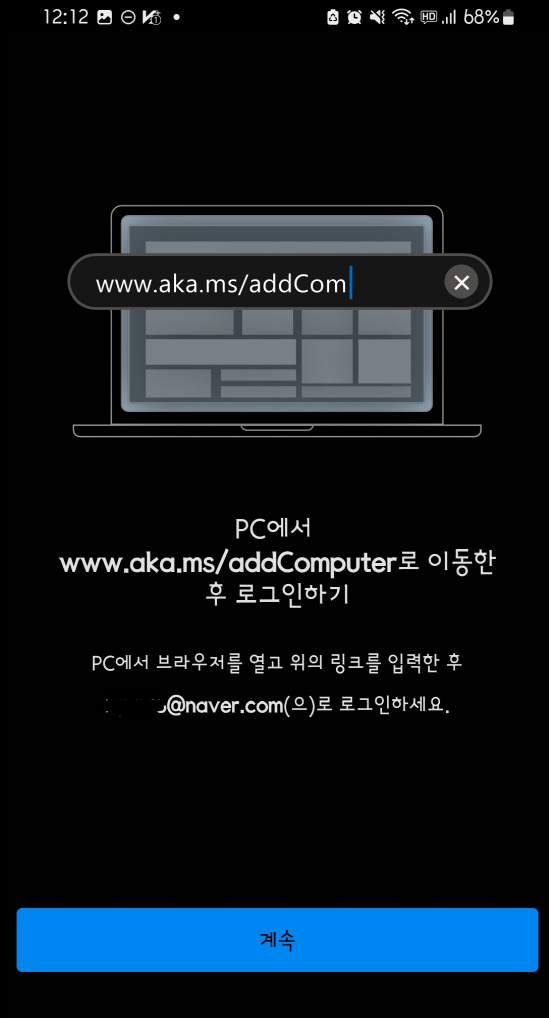 핸드폰에서 www.aka.ms/yourpc 로 주소를 검색하여 들어갈 수도 있는데. 핸드폰에서 url 검색하는 것은 좀 불편한 감이 있으니 핸드폰에서 '컴퓨터추가' 라는 버튼을 눌러서 pc에서 www.aka.ms/addComputer 로 이동하는 방법을 사용해보겠습니다. 어디서 처음 연결을 시작하든 어쨌든 연결이 가능합니다.