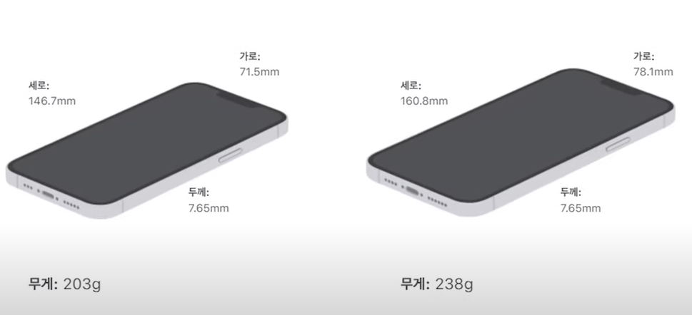 요즘 추세에 따라 핸드폰의 무게는 계속 무거워지고 있는데, 13보다 더 무거워진다면 많이 치명적일 것 같습니다. 실제로 240g이었던 전작 사용자들의 후기를 보면 웬만한 사용자한테 무겁다는 인식이 있었습니다. 여기서 더 무거워지진 않기를 바랍니다.