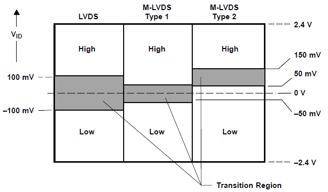 최대 임계값과 최소 임계값 사이의 차동 입력 전압은 Transition 영역에 있으며, 결과적으로 불확정한 출력 상태가 됩니다. 출력이 High, Low 또는 상태 간 이동 중일 수 있습니다. 전환 중 출력의 시간 변동 동작은 수신기의 대역폭과 입력 전압의 시간 변동에 따라 달라집니다.