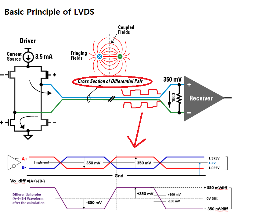 LVDS는 신호의 진폭이 작고 두 선로가 전자기적으로 커플링되어 있기 때문에, RE(Radiated Emission)에 강하고 잡음에 강하며, 전력 소모가 작다.