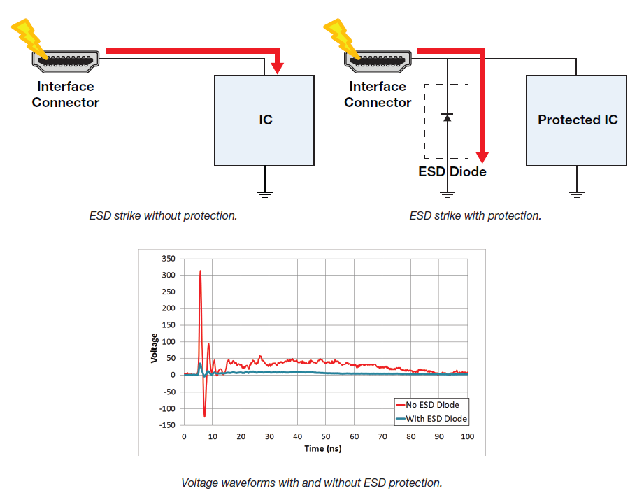 ESD는 쉽게 말해서 정전기이다. 회로가 동작할 때 전하가 축적되어 스스로 발생할 수도 있고 사람 손에 의해서 발생할 수도 있다. ESD는 순간적이지만 IC 소자를 태워버릴 수 있다.