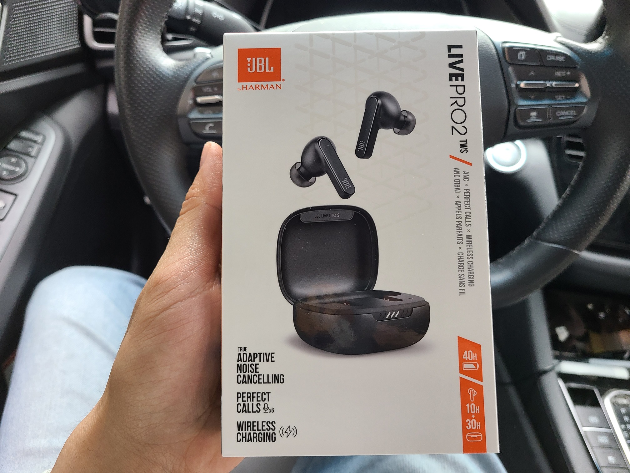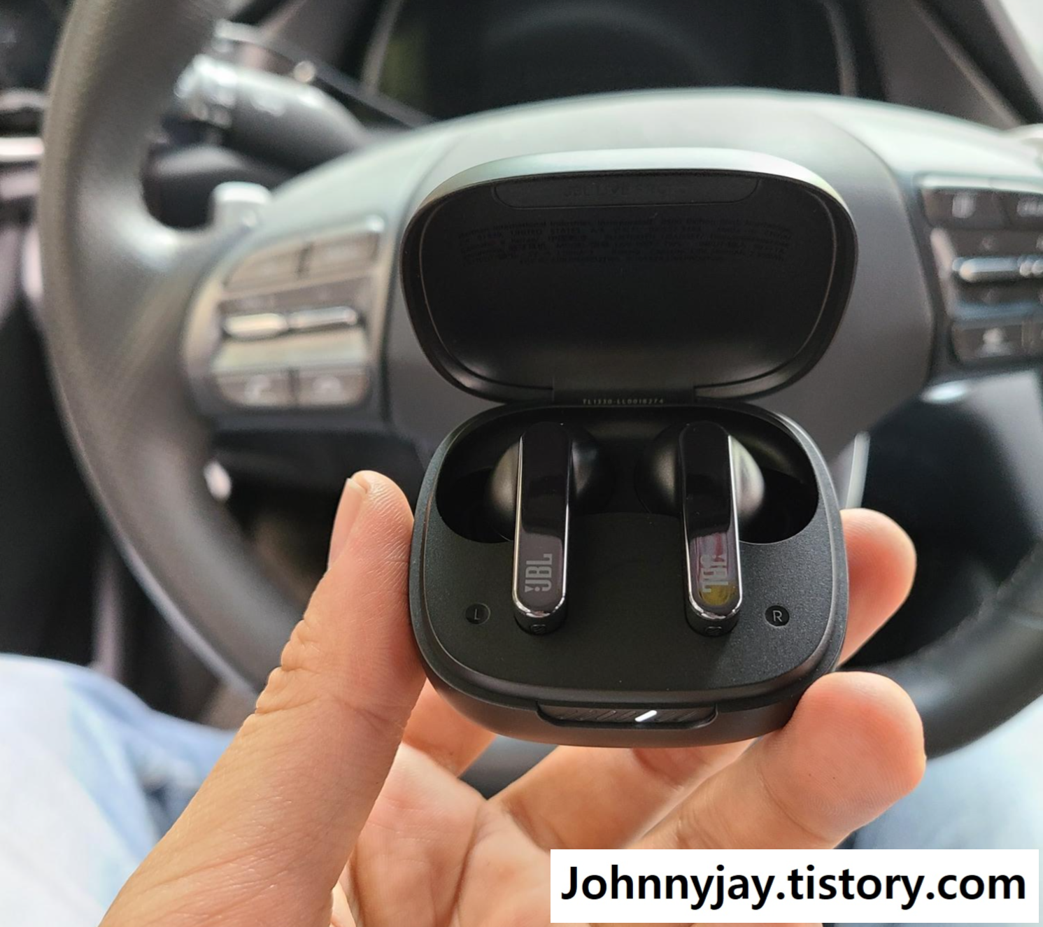 JBL Live Pro2 검정색의 실물입니다. 케이스는 무광이고 엄청 가볍고, 이어폰 유닛은 유광인 게 마치 보석케이스에서 보석을 꺼내는 느낌입니다. 보석케이스도 무광이고 보석은 유광인 것처럼 말이죠.