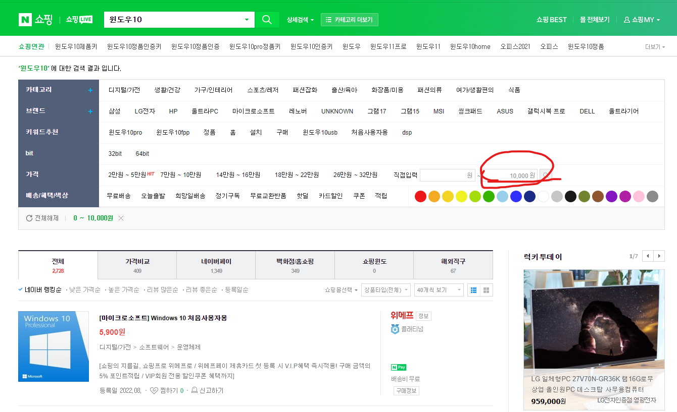 1. 네이버쇼핑에서 윈도우10 혹은 윈도우11, 혹은 MS오피스를 검색한다.