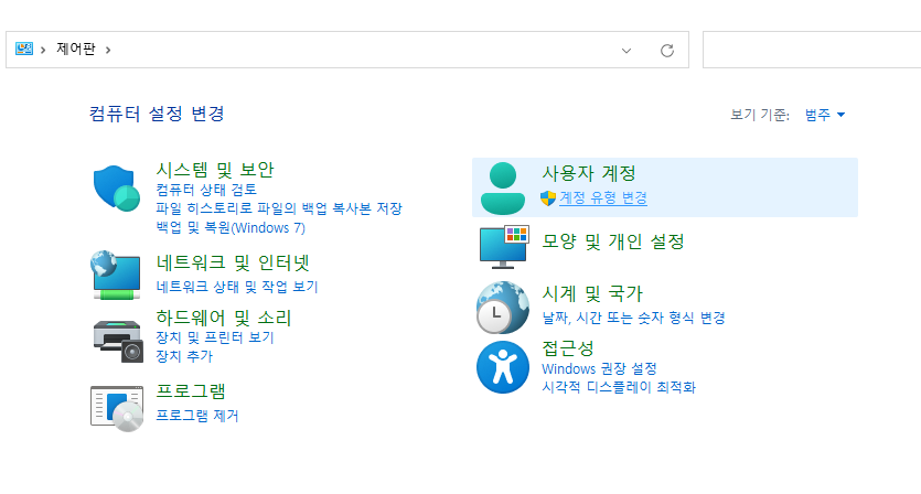 제어판에서 사용자 계정을 클릭해줍니다.