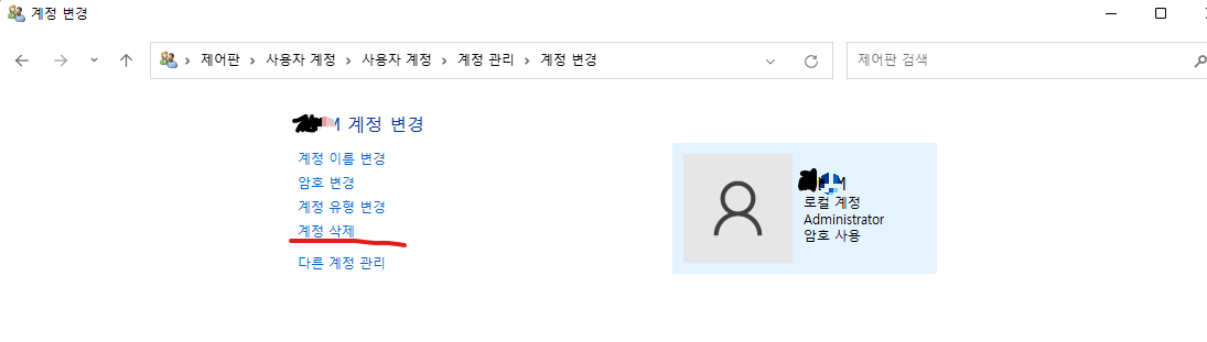 관리자 계정이 존재하니 이제 원래 한글 이름이었던 계정을 그냥 과감히 삭제해버릴 차례입니다.
