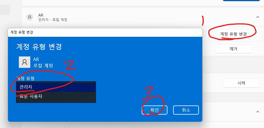 이렇게 하면 표준 사용자였던 것을 관리자로 바꿔줄 수 있습니다.