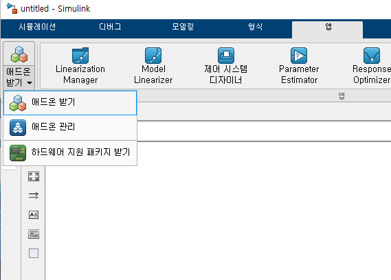 시뮬링크에서 앱 -> 애드온 받기를 클릭하면 애드온 설치 홈페이지로 연결됩니다.