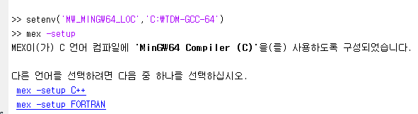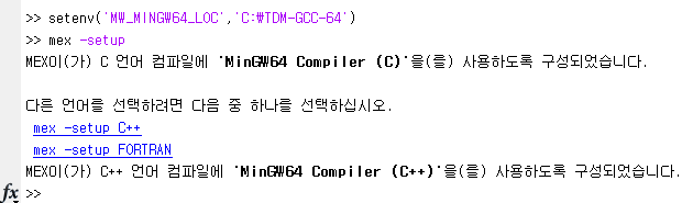 수동설치를 하였으므로 매트랩에서 해당 컴파일러를 활요하기 위해선 아래의 명령어를 커맨드 창에 입력해줘야 합니다.